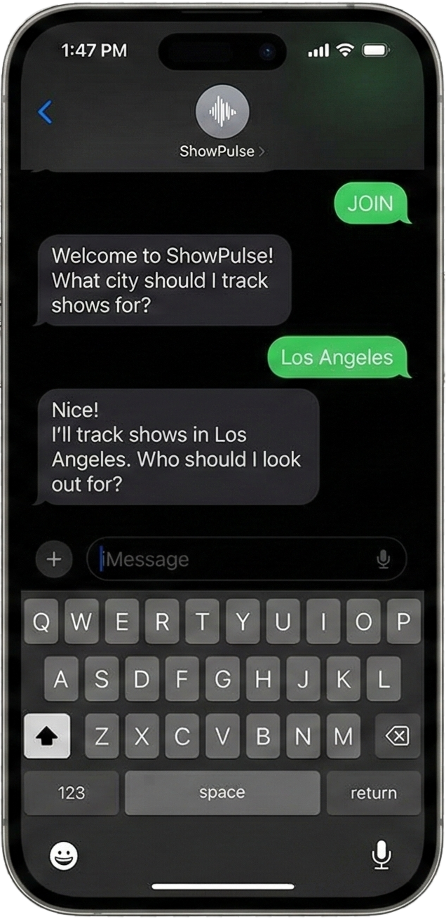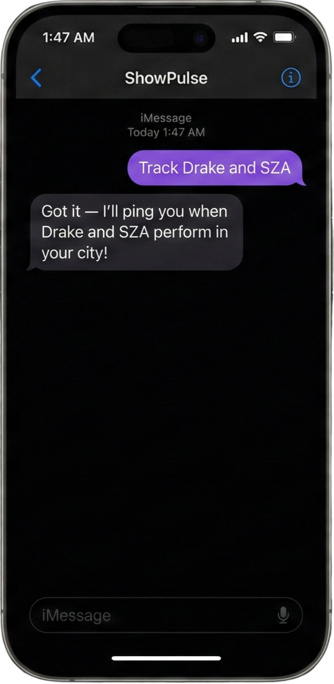 Set your city once and forget it. We'll only ping you about shows happening where you live. Moving? Just text us your new city.