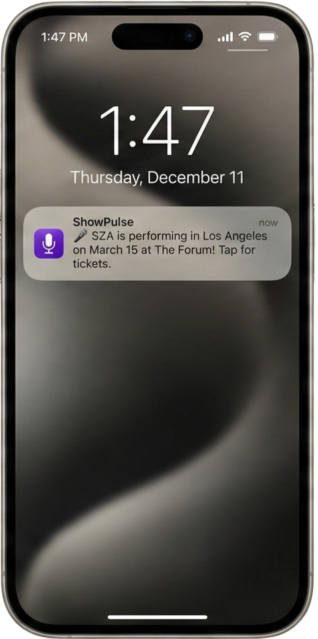 When your favorite artist announces a show in your city, you'll get a text with all the details and a direct ticket link.